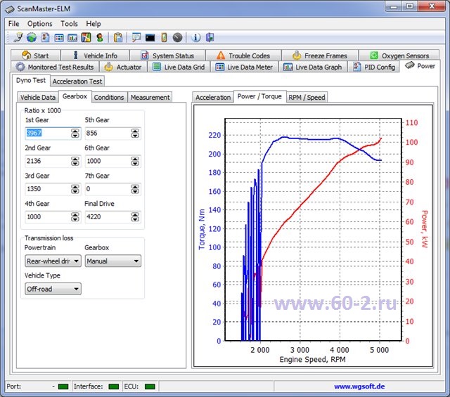 Суть теста сводится в измерении ускорения автомобиля и расчета на этой основе крутящего момента и мощности двигателя. Измерения производились разгоном автомобиля на прямом участке шоссе на 2-й передаче в режиме "тапок в пол" с 1000 до 5000 мин-1.